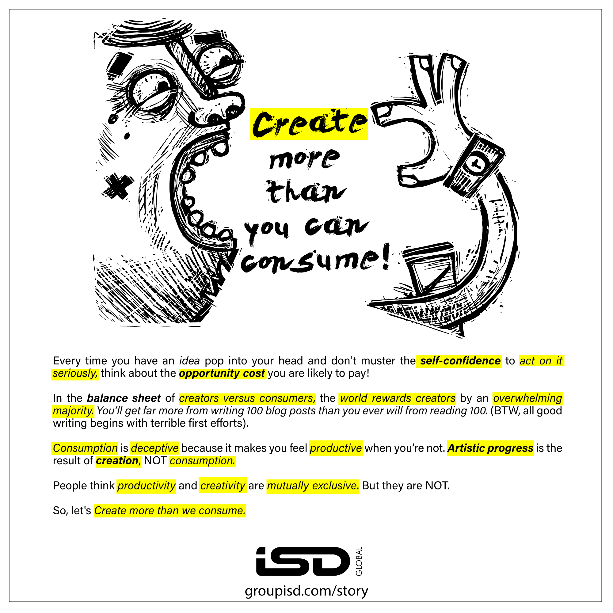 Every hour spent consuming someone else’s creation is an hour not spent on your own. Netflix doesn’t make you Netflix-worthy. Instagram doesn’t make you instantly remarkable. Creation does. Suffice to say that the consumption trap is real.
